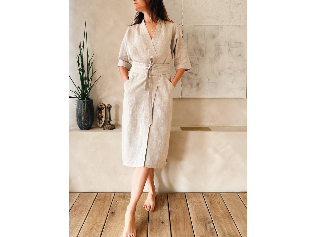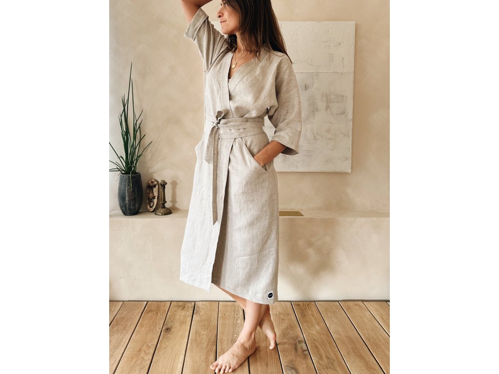 Zatím ten nejluxusnější kousek, který u mě na e-shopu najdete. Lněné zavinovací šaty inspirované asijskou módou. Nechte svou kůži hýčkat přírodním materiálem a zároveň si dopřejte eleganci a styl při všemožných příležitostech. Šaty se vážou na tenkou šňůrku u vnitřního křížení, na knoflík na vnějším křížení a ještě je možné je přepásat páskem. Len je přírodní materiál, který krásně dýchá i v parném létě vám v šatech nebude horko. Velké kapsy pojmou všechny nezbytnosti.