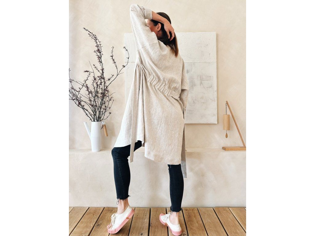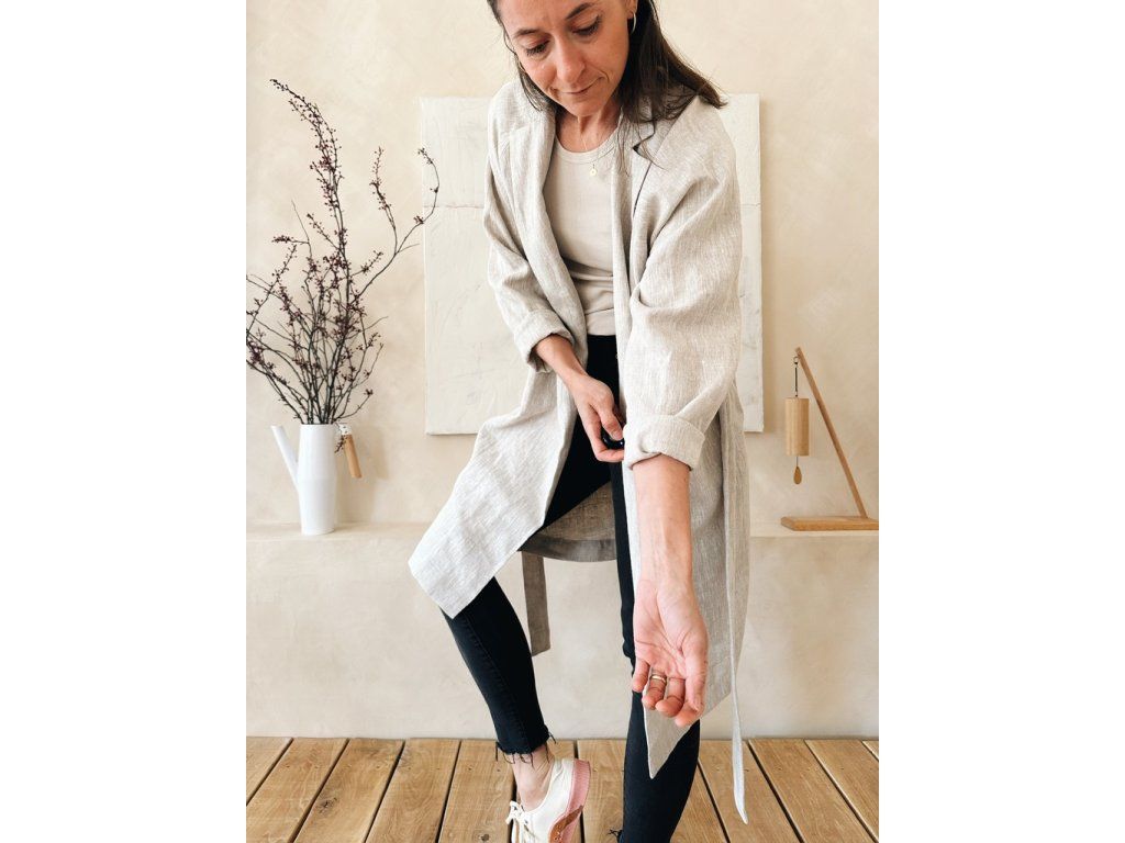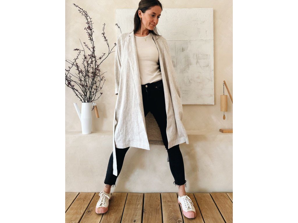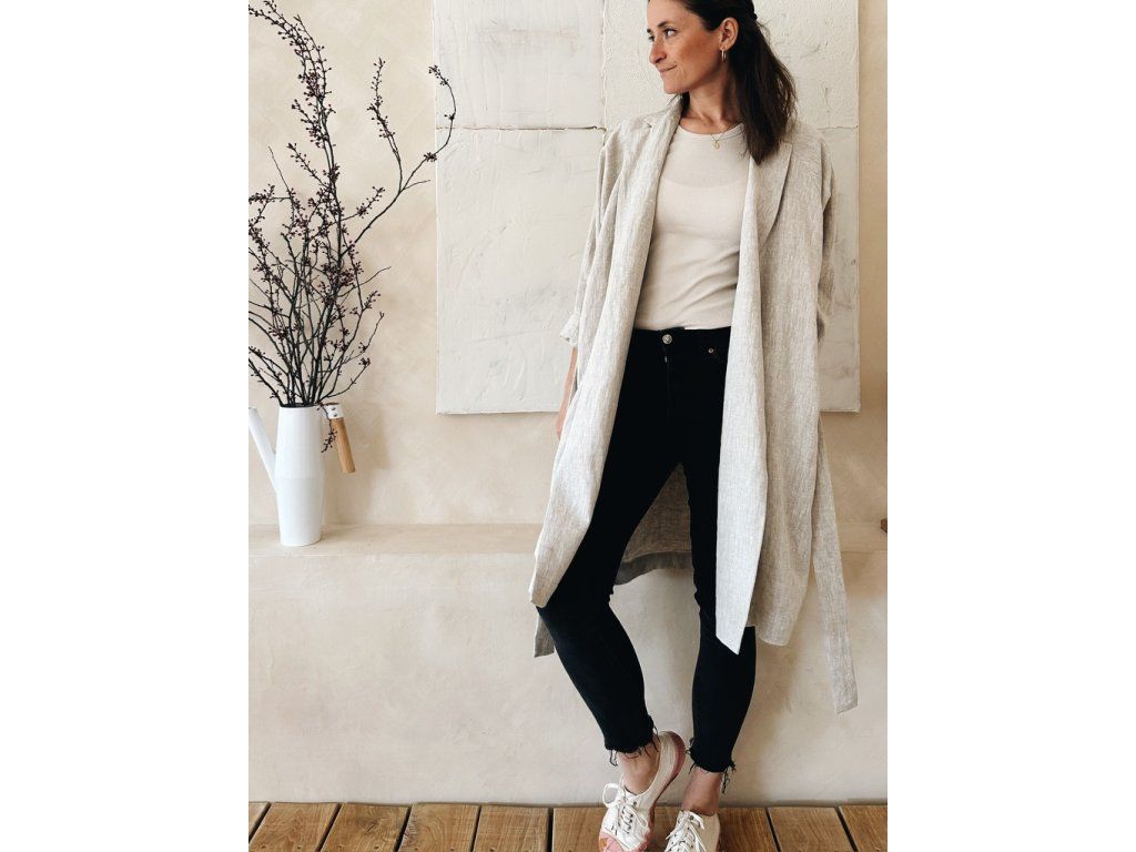 Len jako materiál je přirozeně prodyšný, příjemný na dotek a vhodný i pro citlivou pokožku. S každým nošením navíc měkne a získává charakter, díky čemuž se z kabátu stává osobní a dlouhodobý kousek.