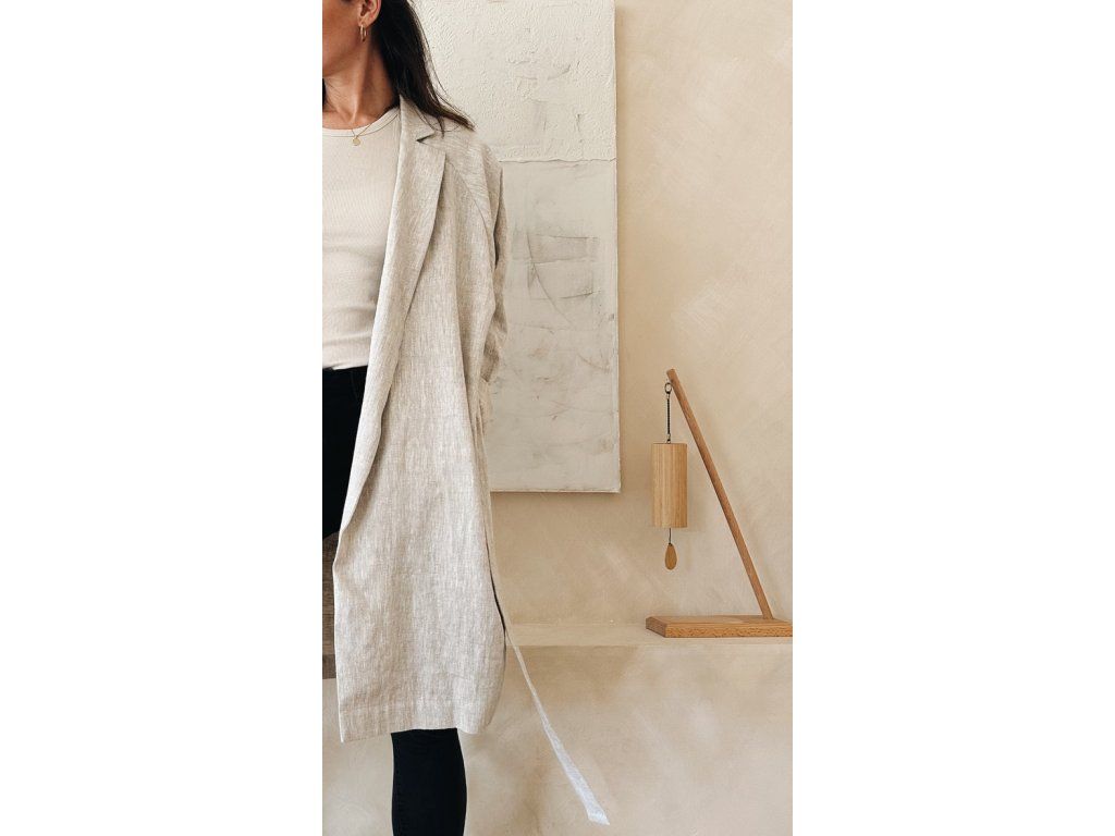 Tento lněný kabát ke kolenům je navržený jako univerzální a nadčasový kousek, který přirozeně doplní váš šatník napříč sezónami. Ušitý je ze 100% lnu v jemném odstínu oatmeal, který působí klidně, přirozeně a snadno se kombinuje s dalšími barvami.